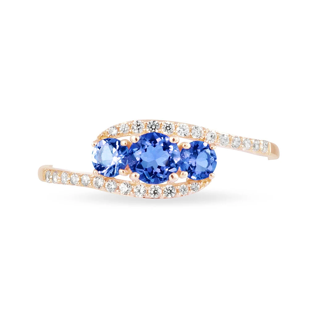 Bague Or Rose 375/1000 Trilogie Saphirs Bleus 0.673ct Sertis 4 Griffes Et Diamants