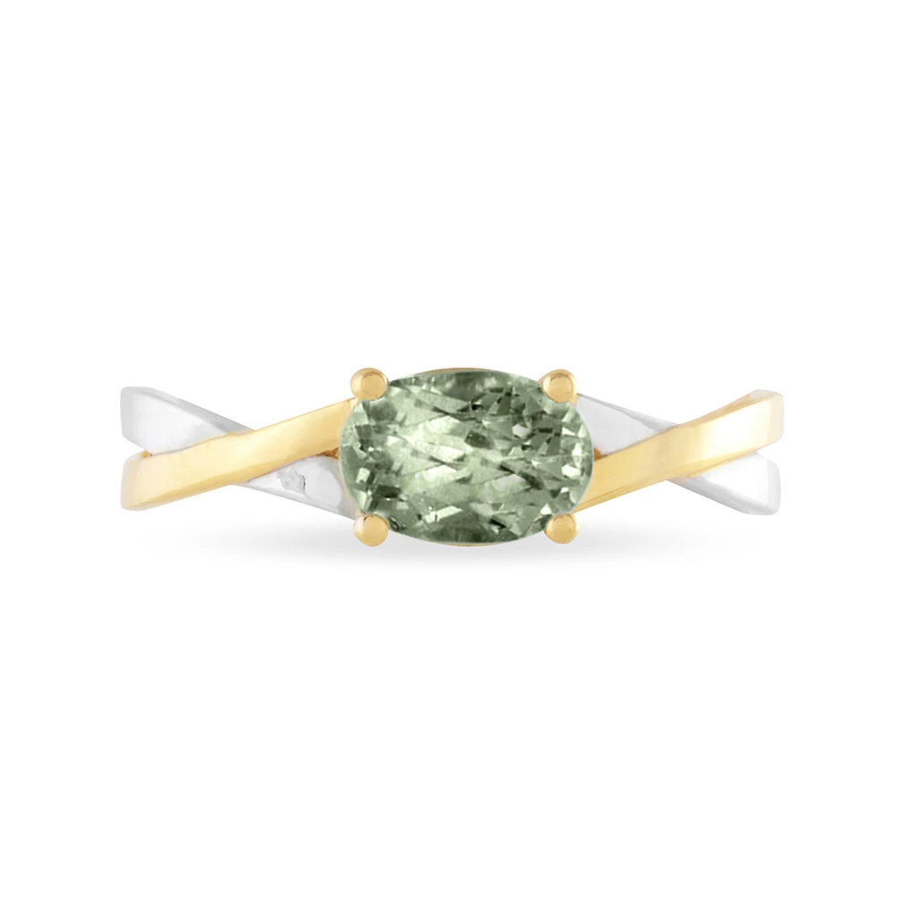 Bague Or Bicolore 375/1000 Améthyste Verte Centrale Corps Entrelace Blanc Et Jaune