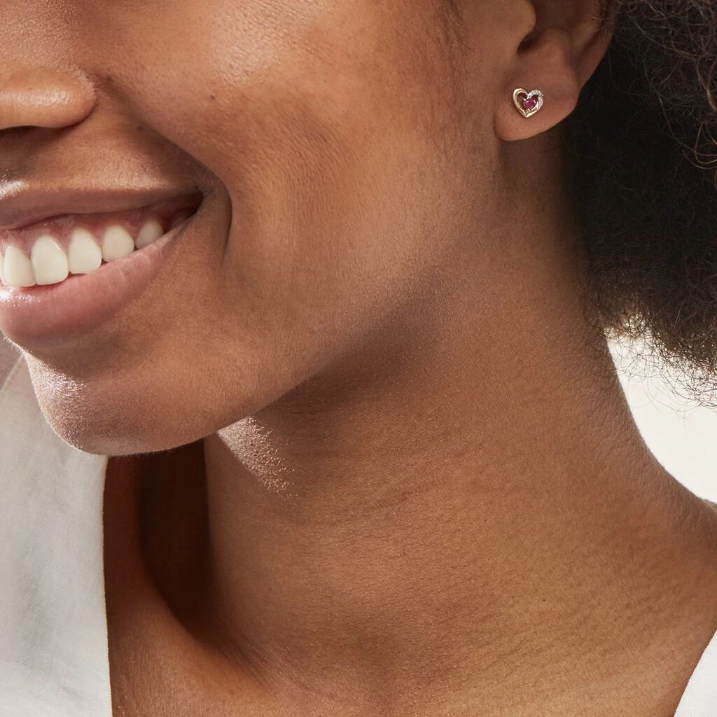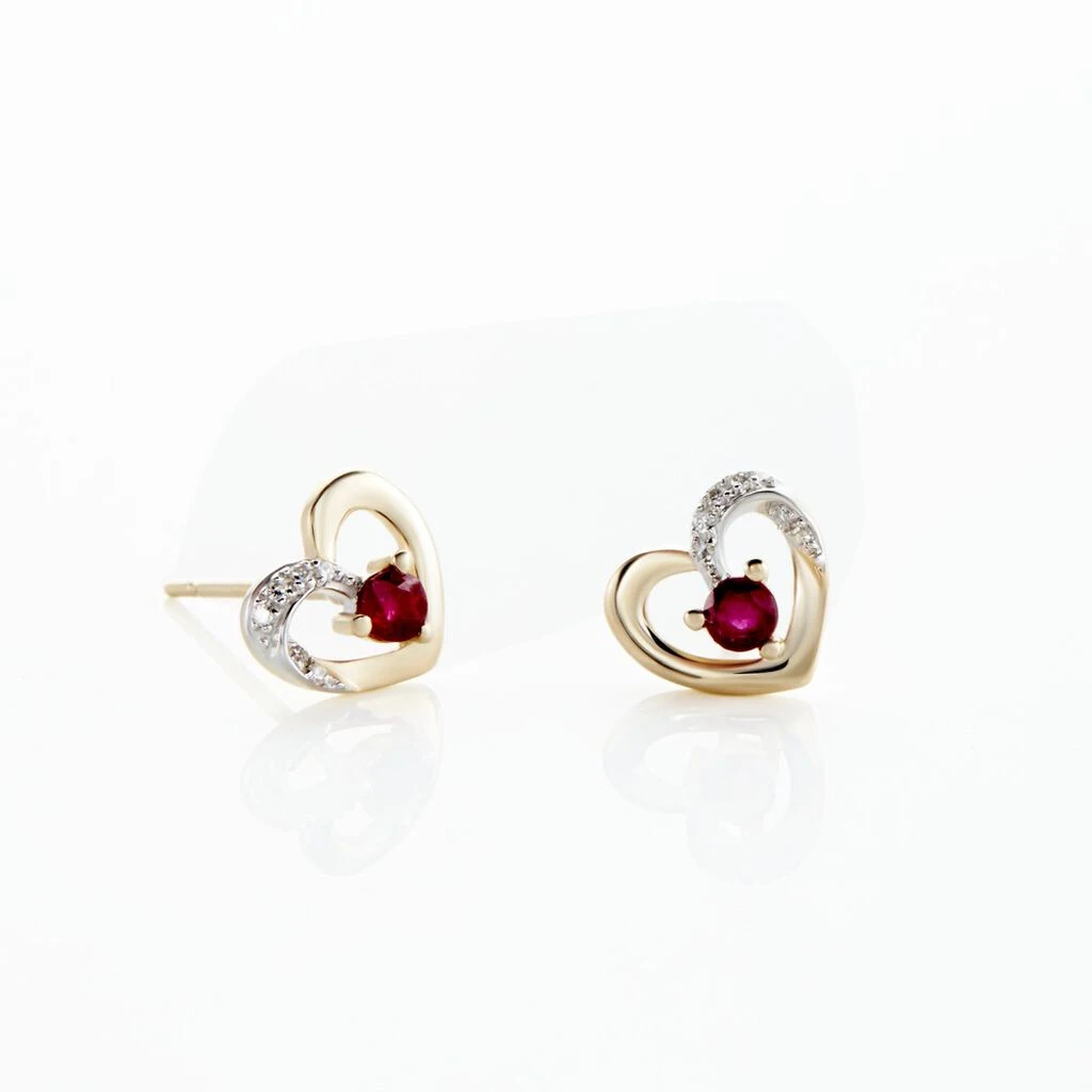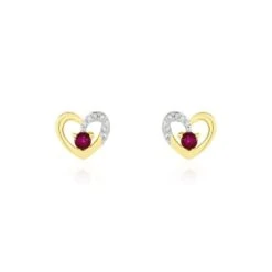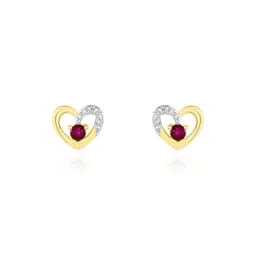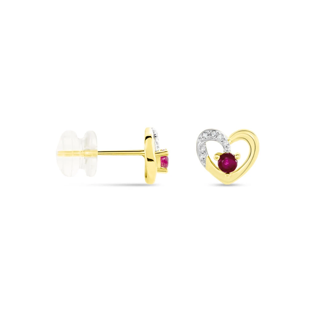 Boucles D’oreilles Puces Or Jaune 375/1000 Cœur Rubis Rouge Griffes Diamants