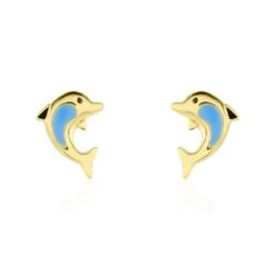 Boucles D’oreilles Or Jaune 375/1000 Puce Dauphin Smalto Bleu