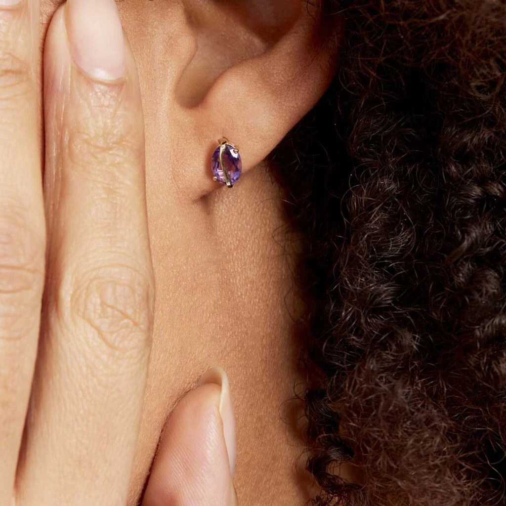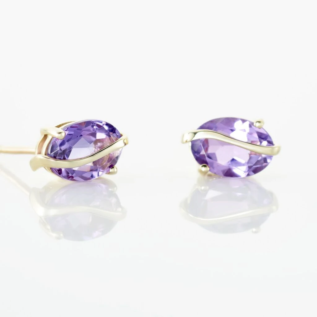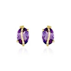 Boucles D’oreilles Puces Or Jaune 375/1000 Améthystes Violettes Ovales Serti 4 Griffes