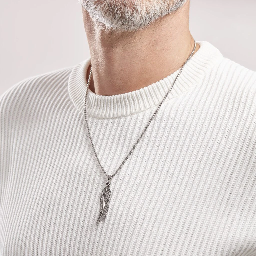 Collier Acier Vieilli Pendentif Plume Maille Venitienne 55cm