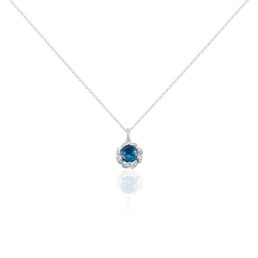 Collier Argent Blanc 925/1000 Fleur En Verre Bleu Serti 6 Griffes Et Oxydes De Zirconium Maille Forçat 44cm